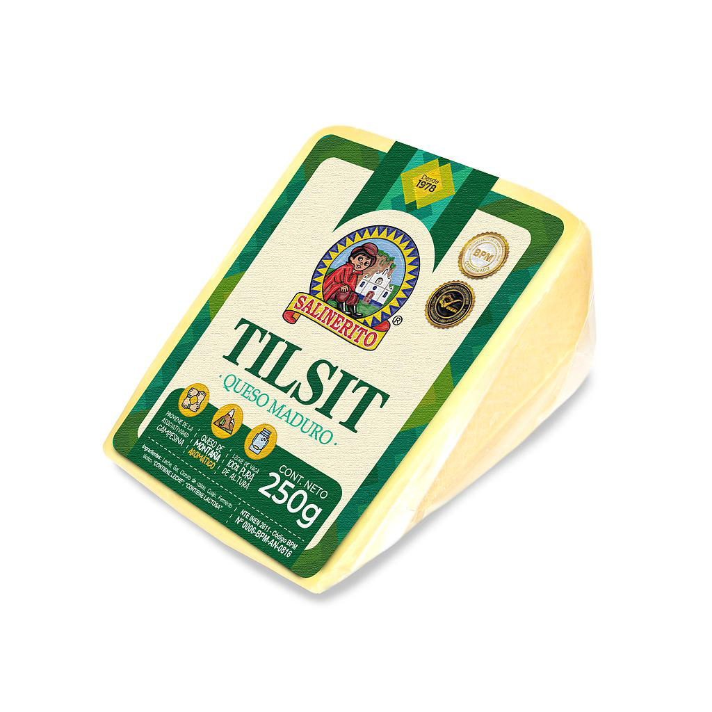 El queso Tilsit Salinerito es una opción gourmet con un sabor único y una textura de pasta compacta y elástica. Elaborado con ingredientes de alta calidad y siguiendo métodos tradicionales de maduración de 5 a 7 semanas, el queso Tilsit Salinerito ofrece una experiencia gastronómica excepcional.